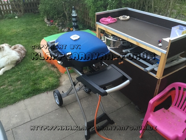 Fest auf dem Scherenwagen montierter Gasgrill, der normalerweise mit Kartuschen betrieben wird. Kann aber über einen Adapter an eine handelsübliche Gasflasche angeschlossen werden.