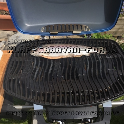 Fest auf dem Scherenwagen montierter Gasgrill, der normalerweise mit Kartuschen betrieben wird. Kann aber über einen Adapter an eine handelsübliche Gasflasche angeschlossen werden.