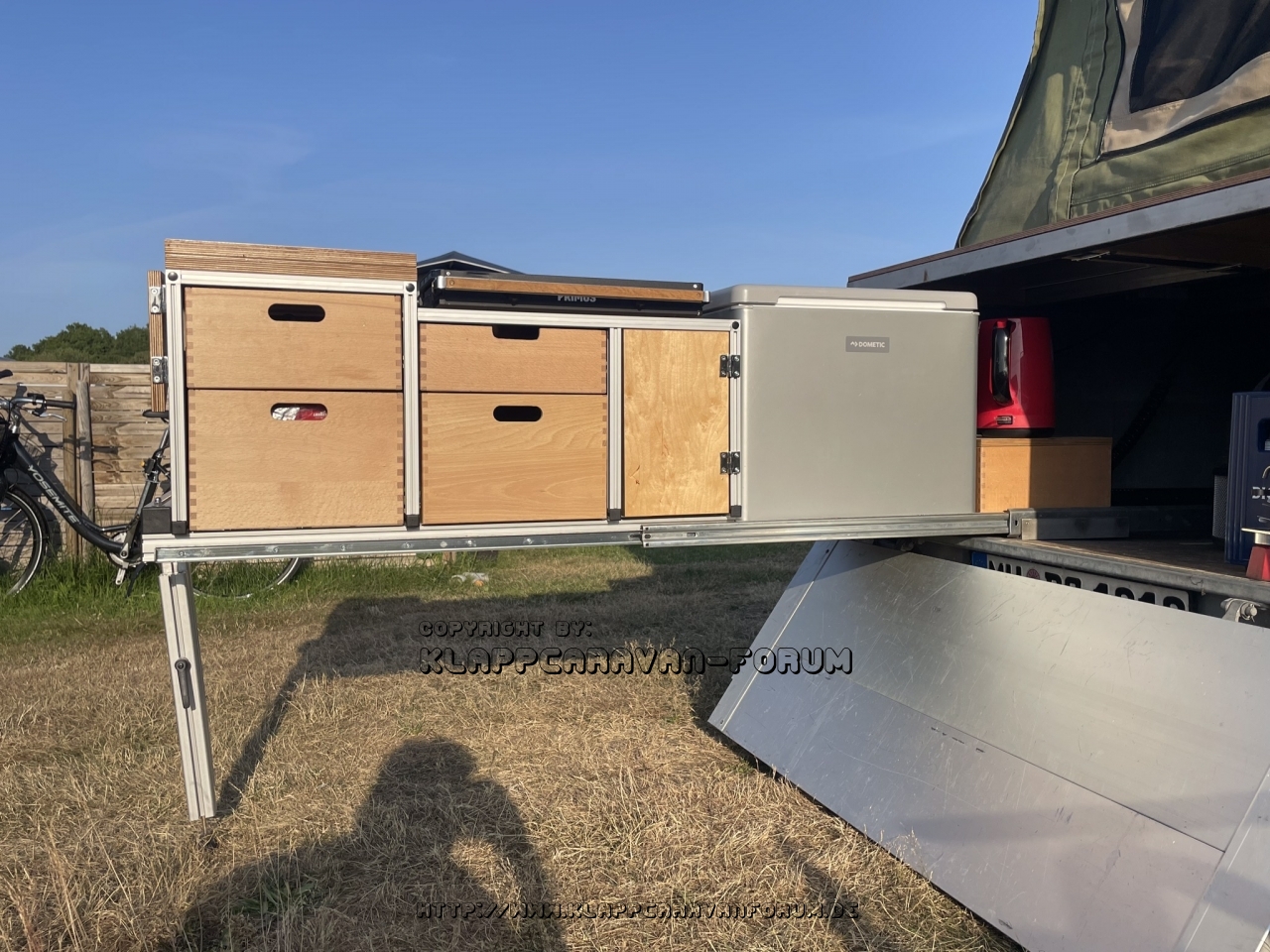 Campingküche aus Aluprofilen 20x20mm auf Teleskopschienen. Multiplexplatte Birke als Arbeitsplatte und Pappel als Wände zwischen den Aluprofilen. Boxen aus Buchenholz vom Bauhaus als Schubladen.