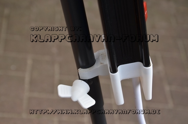 Wir werden ja alle nicht jünger... Deshalb habe ichan den Boden unserer Steckdosenleiste zwei Heizungsrohrklemmen geklebt und geschraubt. So kann die Leiste an jede Zeltstange in jeder Höhe geklemmt werden, ohne dass man sich Bücken muss, um an sie heranzukommen. Solche Klemmen (bei uns 16mm) gibt es im Baumarkt, und man kann sie auch für alles mögliche gebrauchen, z.B. als Lampenhalter, etc.