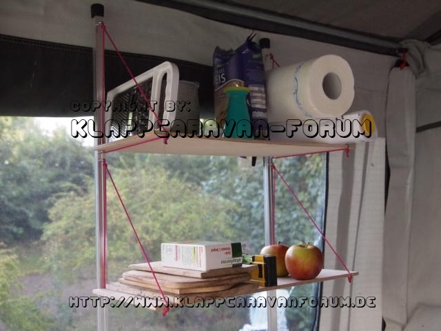 Die senkrechten Stangen des Regals sind aus Vierkant Aluprofilen aus dem Baumarkt, ich habe jeweils 2 Aussparungen wie bei den Bettbeschlägen (so eine Form wie ein umgedrehtes Schlüsselloch) eingefräst. Diese schiebt man auf je einen Schraubenkopf auf der Rückseite des Korpus. Das Regal lässt sich sehr platzsparend verstauen (die Leisten kommen unter die Matratze zwischen die Dachlatten). Die Brettchen halten in den fixierten Schnüren.
