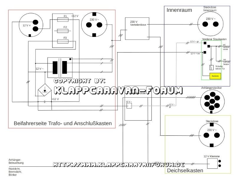Original kamen 12V aus dem 7ten Anhängersteckdosenpol. Das diente dazu den WoWa platzunabhänig zu nutzen. Im zusammengeklappten Zustand wird die Leitung aber abgeschaltet. Bei der E-Verteilung müsste ein kleiner Tippschalter sein, der gegen die Front- oder Rückwand drückt.