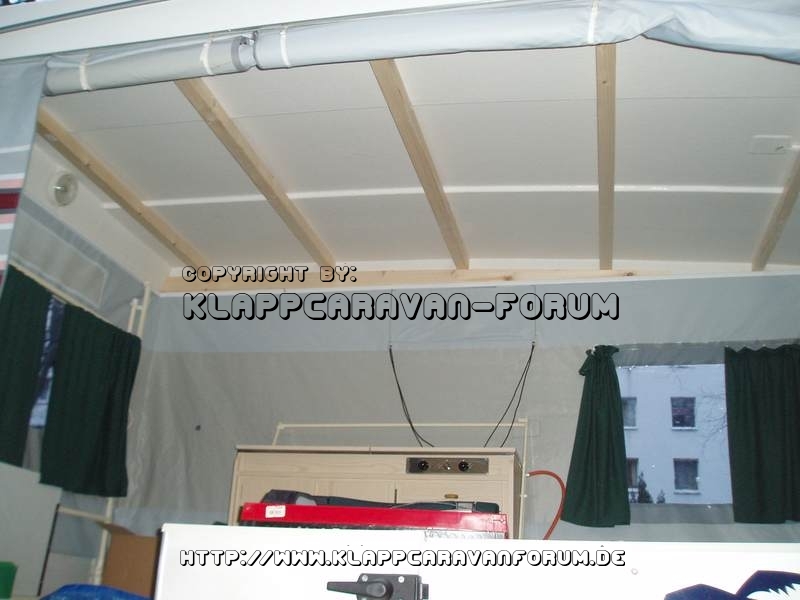 Bei geschlossenem Dach habe ich zwischen unterem Küchenschrank und Dach noch 6-9cm Luft. Dem Zeltstoff sollte ich wohl 2-3cm geben, um nicht zu sehr geknüllt zu werden. Bleiben 4 bis 6 cm Höhe Querträger. Die lichte Höhe zwischen Dachrahmen und Unterkante Dach beträgt in diesem Bereich bei mir 12 bis 13 cm (bei meinem Paradiso ist das Dach hinten hochgezogen, wohl ab Baujahr 97. Zwischen Querträger und Dachrahmen kommt einfach ein hochkant gestelltes Brett, dies verteilt dann auch die Last vom Querträger über die Länge.