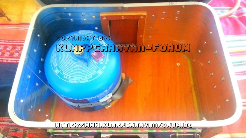 Hier die Box ausgraeumt bis auf die Gasflasche, ich hab noch a kleinere auf Reserve im Auto, hinten sieht ma Klappe, da geht der Schlauch dann rein, da kann ich auch reingreifen und des Gas direkt an der Flasche abdrehen, nach'm Kochen....Flasche ist mit am Haltegurt an den Seitenwaenden und am kleinen Sperrholzring am Boden fixiert....a paar Belueftungsoeffnungen sind da auch noch, ned dass ich paranoid waer...aber...