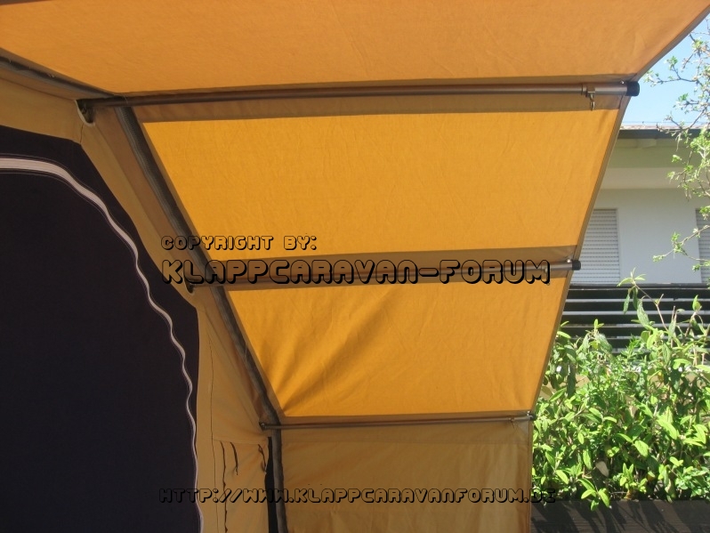 Das Segel ist am Hauptwagen ca. 100cm und am Vorzelt ca. 80cm lang. Da das Vorzelt vom Reißverschluß (RV) bis vorne zu den Ösen ein kleines Vordach von 20cm hat.