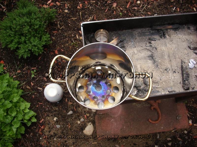 es geht weiter. Um die Kohlenbriketts anzuheizen, habe ich mir so einen Feuerstarter gebaut. Kann man natürlich kaufen, finde die aber nicht wirklich gut. Also habe ich fürn Euro einen Spargeltopf in der Bucht geschossen und den Deckel als Auflagerost für die Kohlen modifiziert. Dann wurden Luftlöcher mit Abstand zum Topfboden eingebracht und der Deckel in den Topf versenkt. Nun kann ich Brennpaste in den Topf geben und auf den Rost die Kohlen zum Glühen legen. Da das ganze aus rostfreiem Stahl ist, brauch ich mich um hitzefeste Farbe nicht zu kümmern.