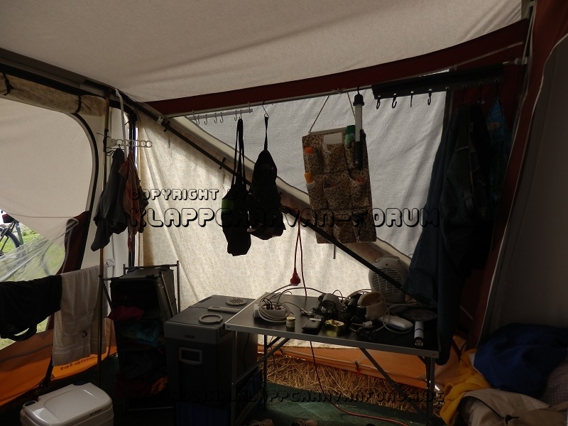 8027 Eine zusätzliche Stange bietet viel Platz zum Aufhängen, die Hakenleisten bleiben beim Abbau dran. Die schwarzen Klettverschlussleisten sind besser als die weißen Kunststoffleisten. Bei diesen brechen die Haken ab.