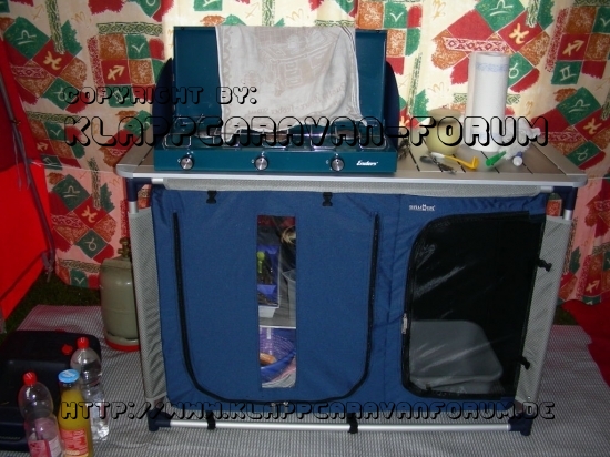 Mit dem Erwerb unseres Sk-Falters ist auch eine 2-flammige Invicible-Küche, wie sie im Standard mit dabei ist, in unseren Besitz übergegangen. Meine liebe Frau störte jedoch, dass sie nur 2-flammig ist und mich, dass sie eine Menge Platz wegnimmt. Nach einigem Hin und Her haben wir uns daher entschlossen, weiter auf unseren Enders-Kocher zu setzen, auch wenn die 3. Flamme hier nur für einen Minitopf passt. Nun musste also ein neuer Schrank her. Wir haben uns hier für die große Jum-Box entschieden. Der Aufbau ist mit Stress unter 15 Minuten erledigt, mit Urlaubsstimmung dauert es halt 20 Minuten. Das ist mir aber die Platzersparnis und meiner Frau ihre geliebte und fast nie benötigte 3. Flamme wert.